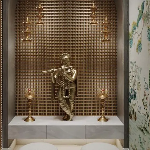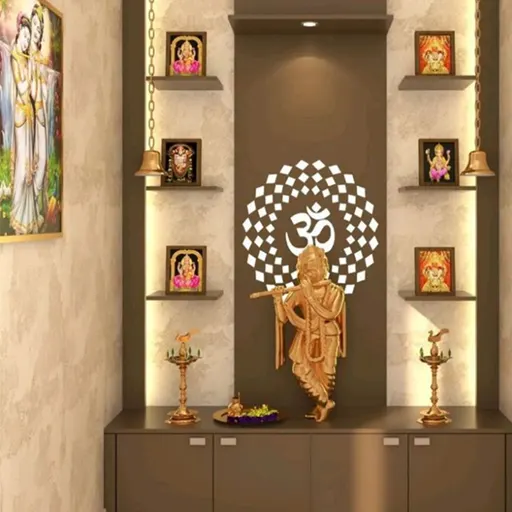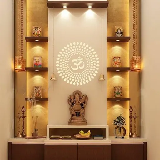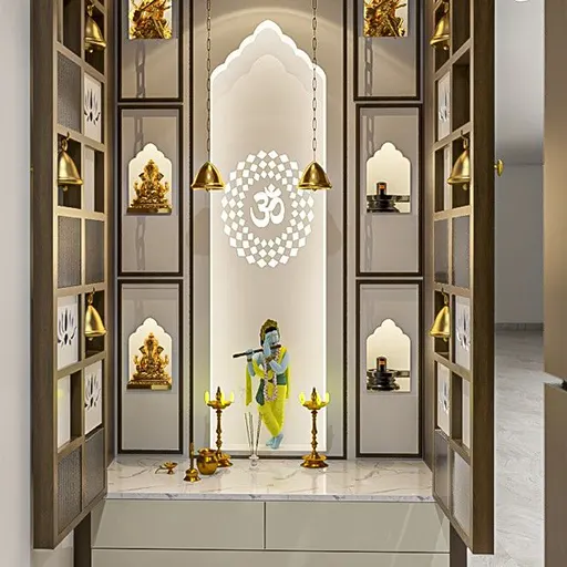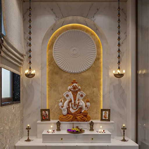Illuminate the pooja space with integrated lighting solutions that enhance the ambiance and focus attention on the sacred rituals. From LED strip lights to recessed lighting and pendant lamps, we offer a variety of options to create the perfect lighting environment for prayer and meditation.